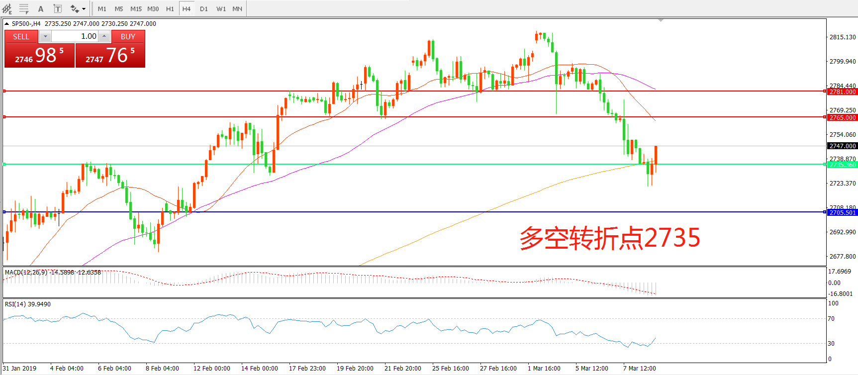 4小时图看,标普500跌破2781支撑后连续下行,形态上呈现空头走势,均线系统拐头向下,MACD绿柱增加,日内延续下行走势概率较大。