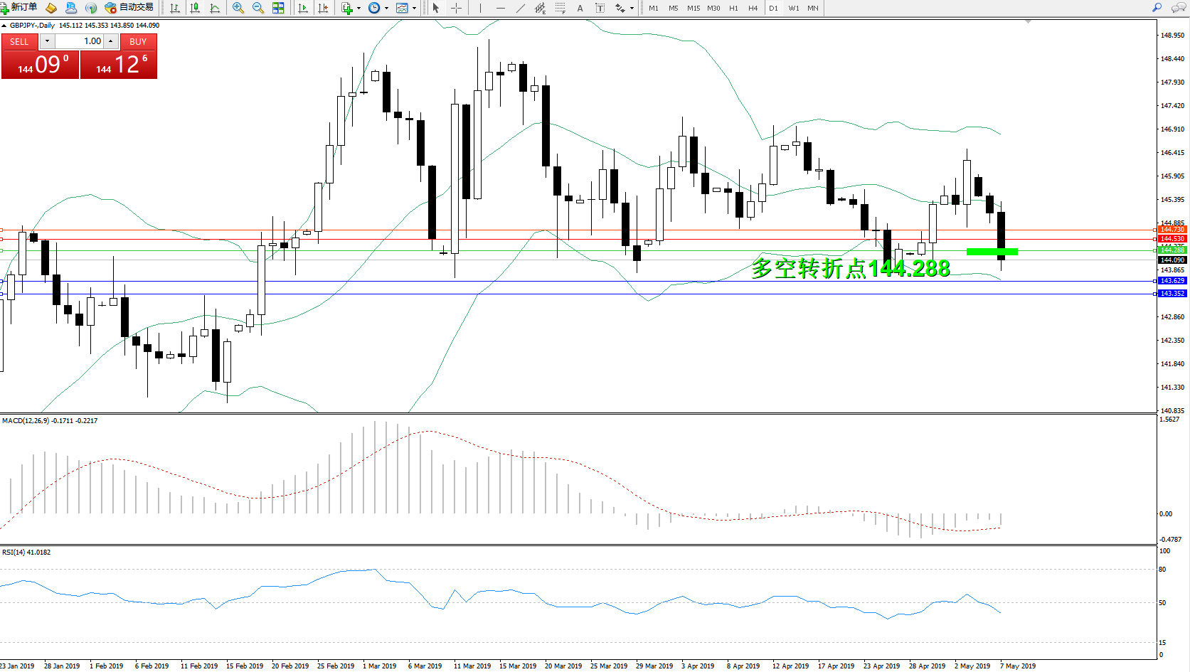 交易策略:144.288下方看跌,目标143.629143.352