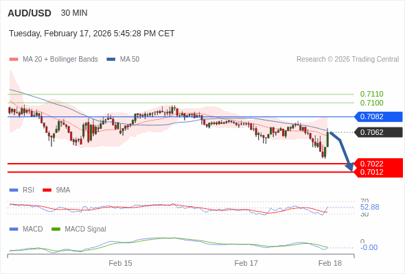 技术点评: RSI技术指标大于中性区域50。 MACD技术指标处在其信号线之下看空。 RSI突破50应该会触发进一步的损失。 另外,价位低于其50天移动平均线 (0.7065 ) 但高于其20天移动平均线 (0.7058 )。