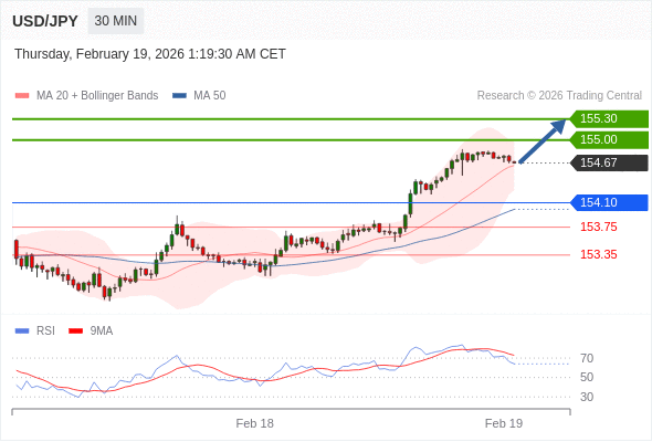 在 154.10 之上,看涨,目标价位为 155.00 ,然后为 155.30 。