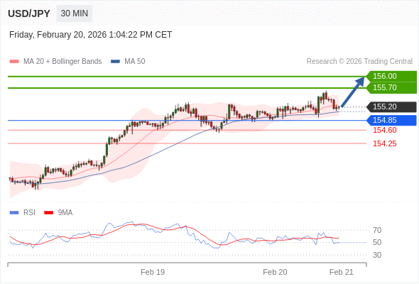 在 154.85 之上,看涨,目标价位为 155.70 ,然后为 156.00 。