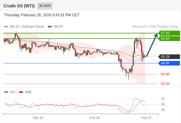 在 64.80 之上,看涨,目标价位为 66.60 ,然后为 67.00 。