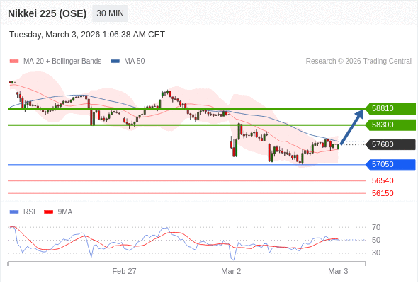 在 57050 之上,看涨,目标价位为 58300 ,然后为 58810 。