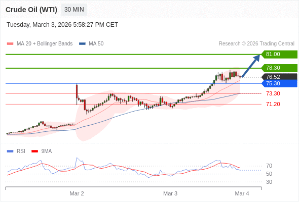 在 75.30 之上,看涨,目标价位为 78.30 ,然后为 81.00 。