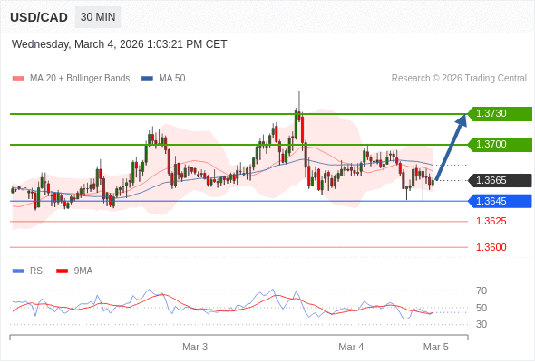 在 1.3650 之上,看涨,目标价位为 1.3700 ,然后为 1.3730 。