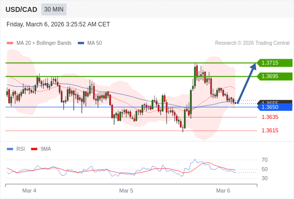 在 1.3650 之上,看涨,目标价位为 1.3695 ,然后为 1.3715 。