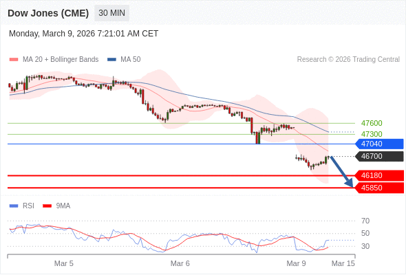 美国道琼斯指数期货 (H6) 当日内: 短期关键阻力位在47040。