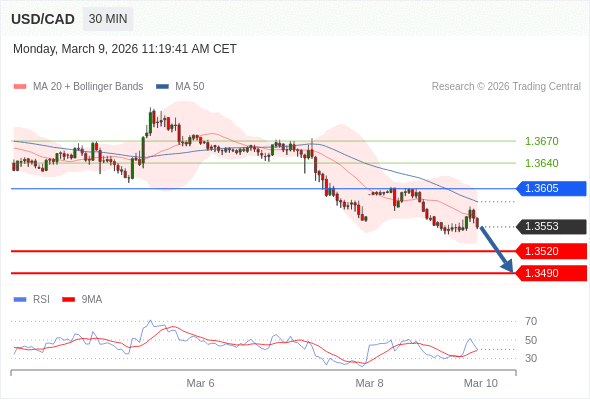 在 1.3605 之下,看跌,目标价位为 1.3520 ,然后为 1.3490 。