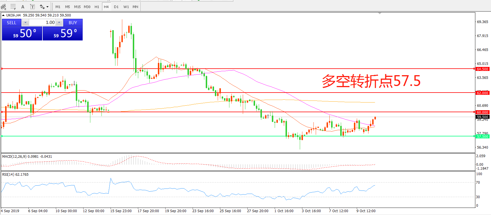 4小时图看,油价企稳后震荡反弹,均线系统阻力被突破,整体走势有所回暖,60美金成为下一目标,MACD绿柱缩短,RSI指标向上,日内延续上行概率较大。