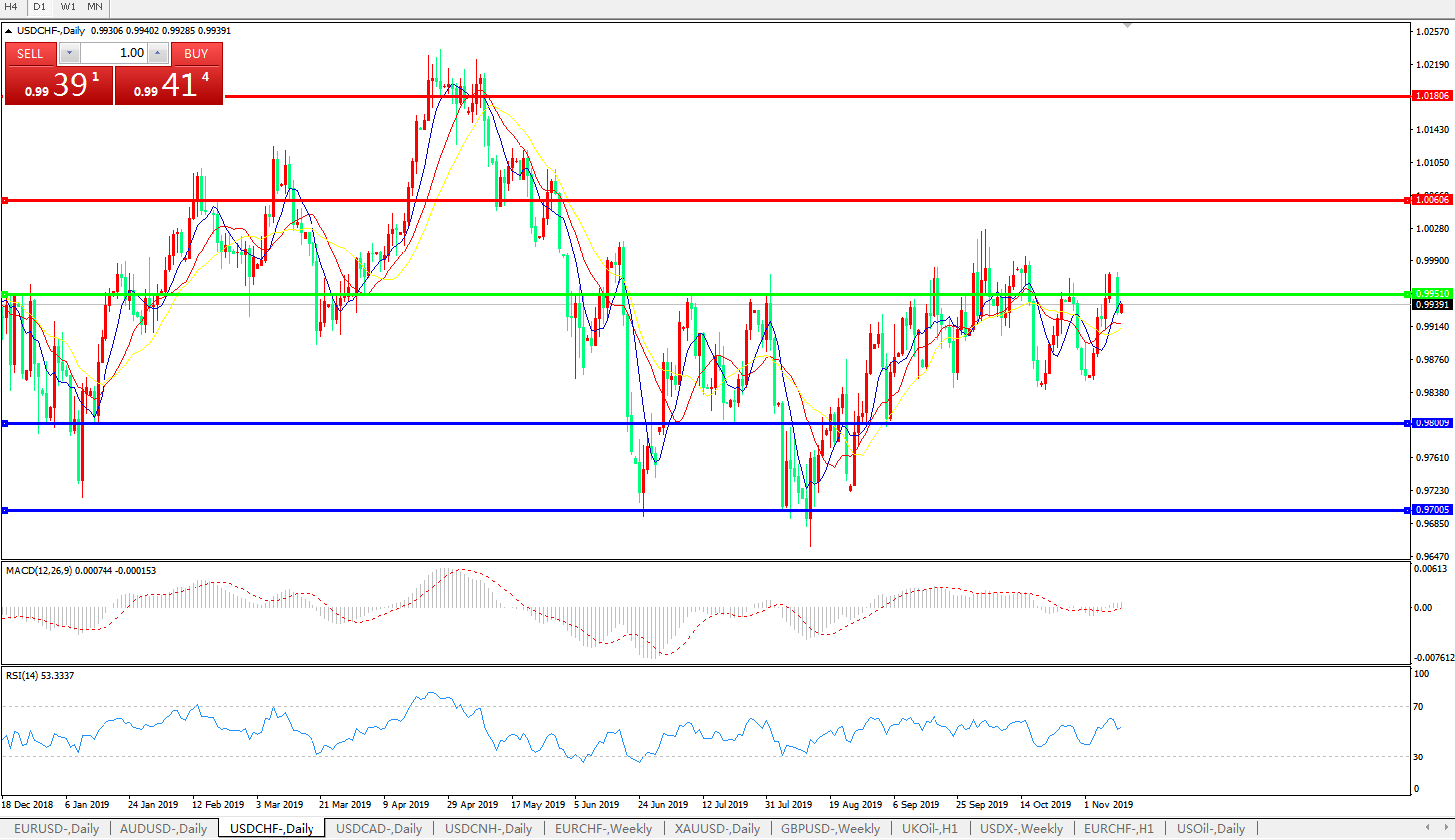 交易策略:0.9950下方看跌,目标0.9800、0.9700