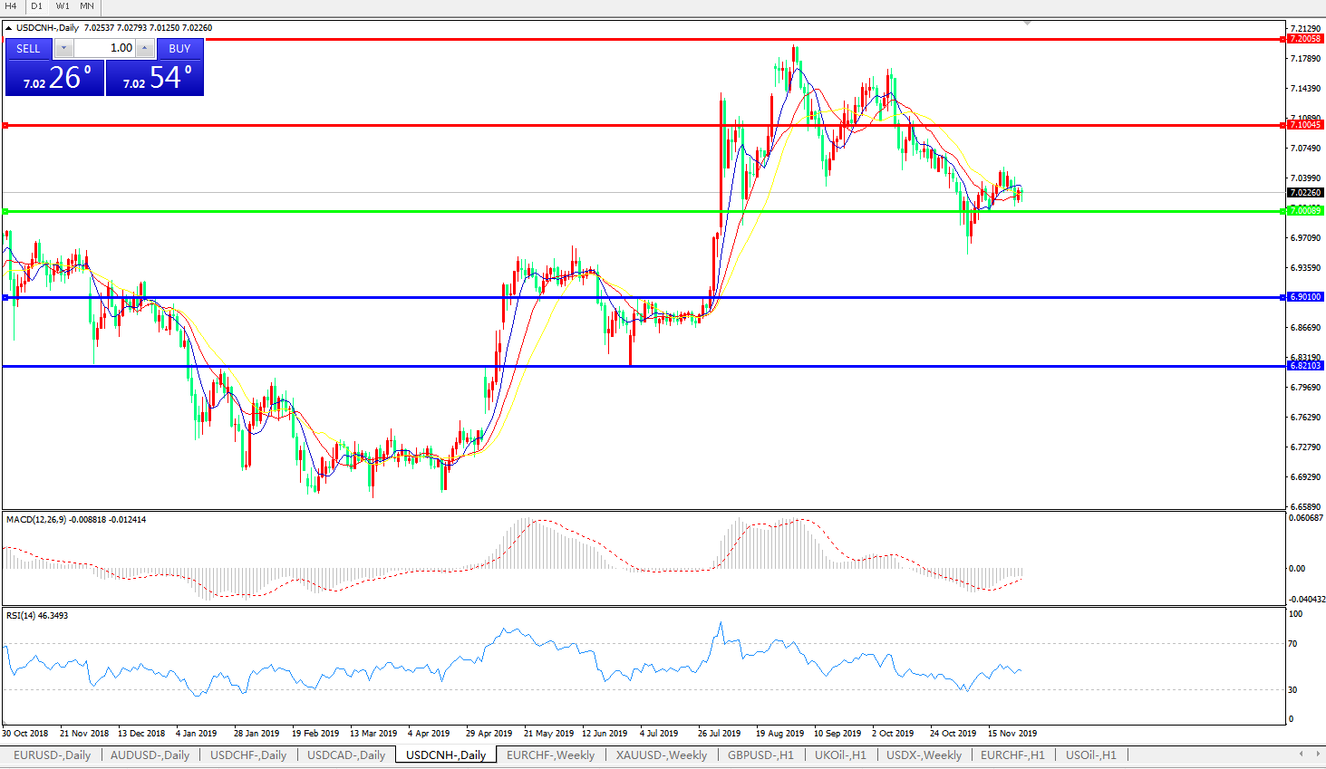 技术面简析:日图均线走平且粘合无明显方向,汇价7.0关口上方持续窄幅整理,MACD运行于0轴下方但量能持续收缩,RSI维持整理走平态势,预计短期汇价将在7.0关口附近整理,中期汇价需等待美元指数及中美贸易谈判最新进展指引。