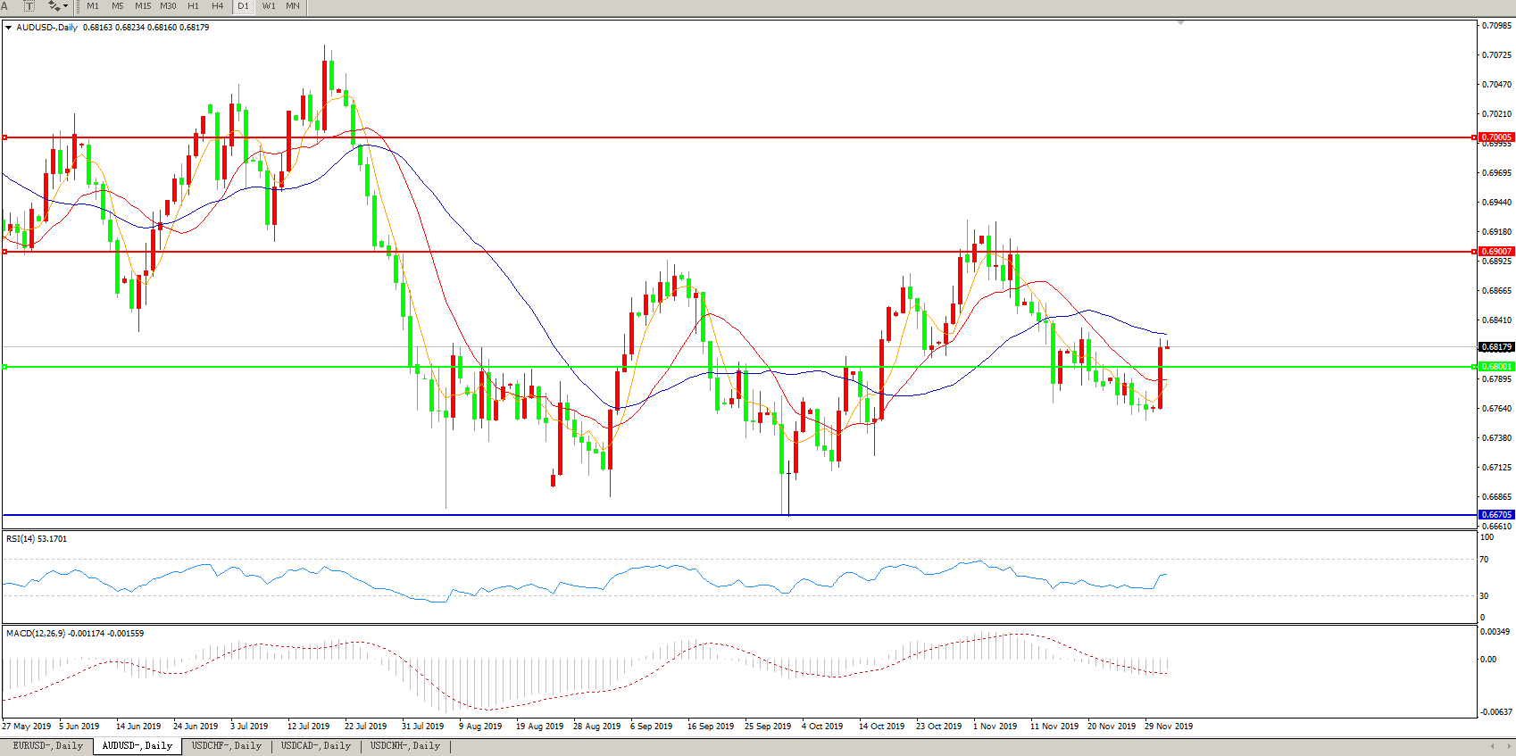 澳元兑美元在周一小幅走高,脱离上周五录得的一个半月低位。此前,中国方面在周末发布了强于预期,重新站上枯荣线的11月制造业PMI数据,这对于与中国经贸往来密切的澳洲经济也是利多,并且继续趋于乐观的全球贸易局势也对澳元也支撑作用;不过,澳元汇价的上涨幅度却仍然受限,0.68关口依旧可望不可及,原因在于投资者面对周二澳洲联储年内最后一次政策会议之前景仍充满戒心。虽然,市场普遍预计澳洲联储立即降息可能仍不大,但仍很可能释放额外宽松信号,为明年2月的下次会议上降息铺平道路。 在此状况下,澳元汇价仍未摆脱过去一个月来的阴跌下行趋势,仅在上破0.6786这一10日均线切入位后,趋势反转才能燃起一丝希望,而这需要内外部基本面消息,及澳洲联储意外偏向鹰派政策姿态的共同配合,方才能够达成