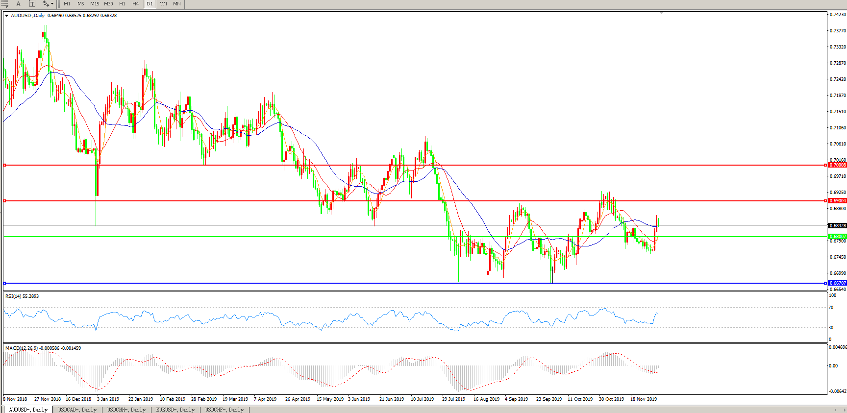 交易策略:0.6800上方看涨,目标0.6900、0.7000