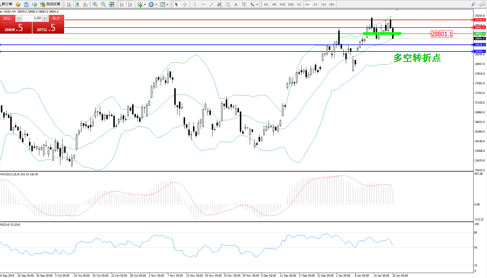 恒指HK50 ——4小时K线图显示: