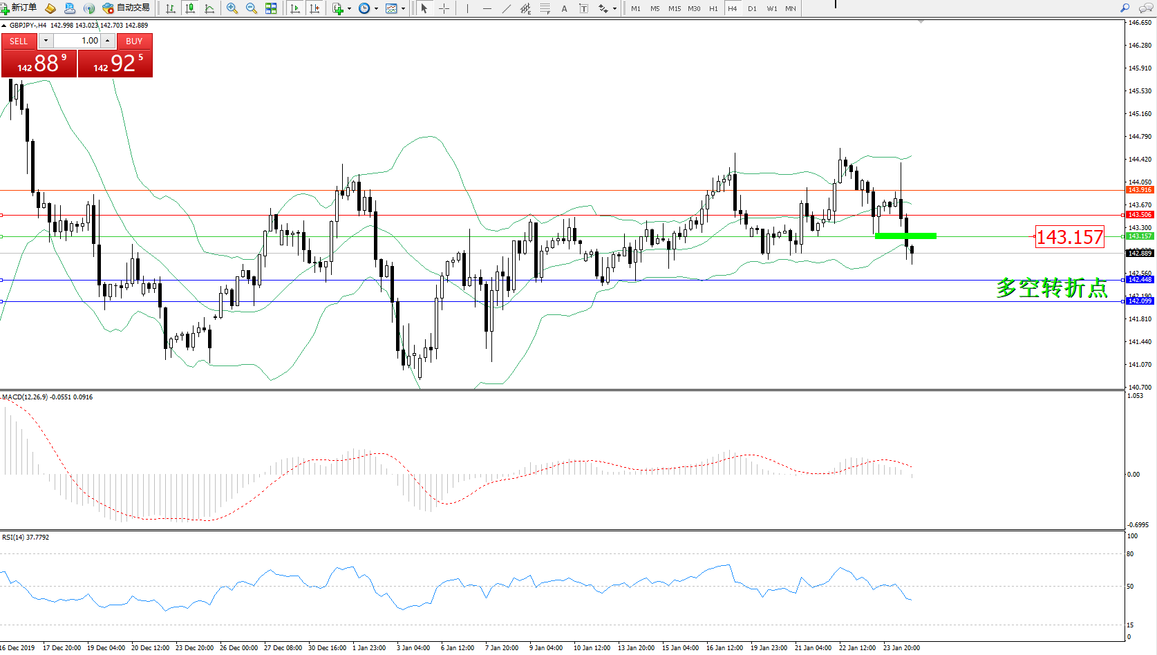 交易策略:143.157下方看跌,目标142.448、142.099