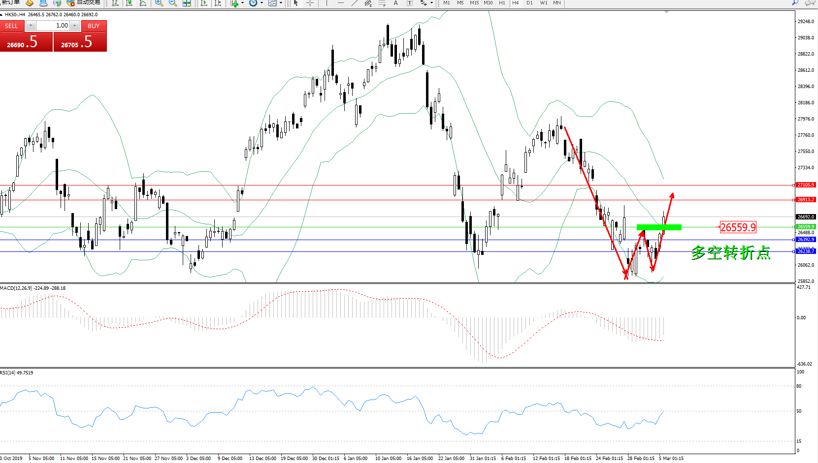 恒指HK50 ——4小时K线图显示: