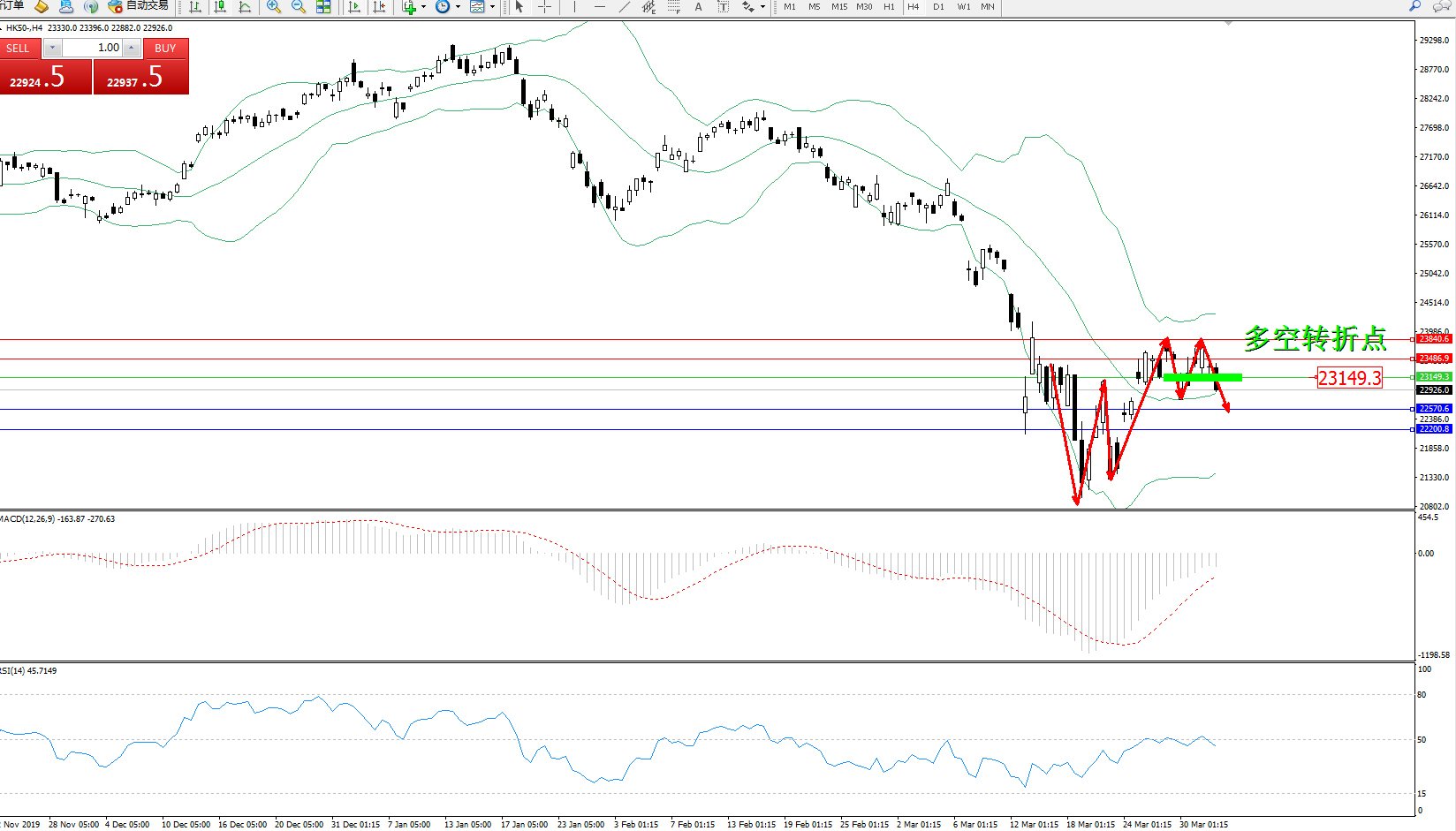 恒指HK50 ——4小时K线图显示: