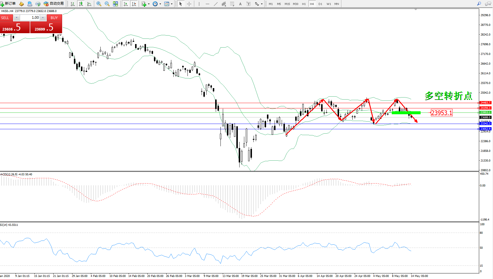 恒指HK50 ——4小时K线图显示: