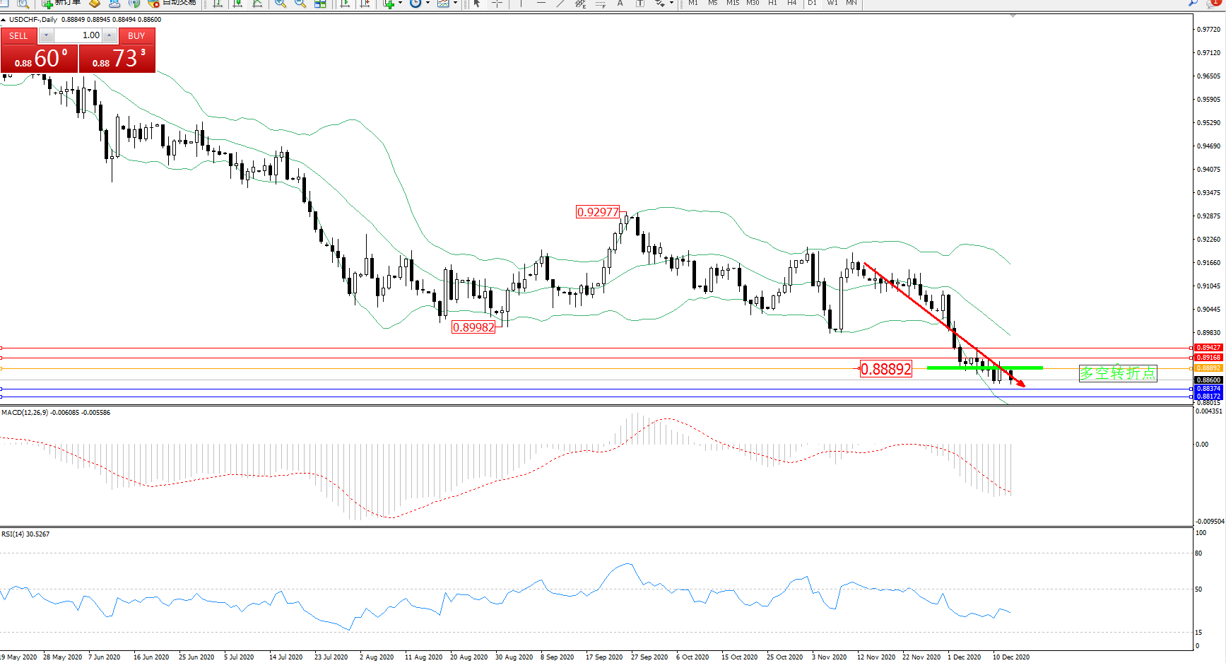 交易策略:0.88892下方看跌,目标0.88374、0.88172