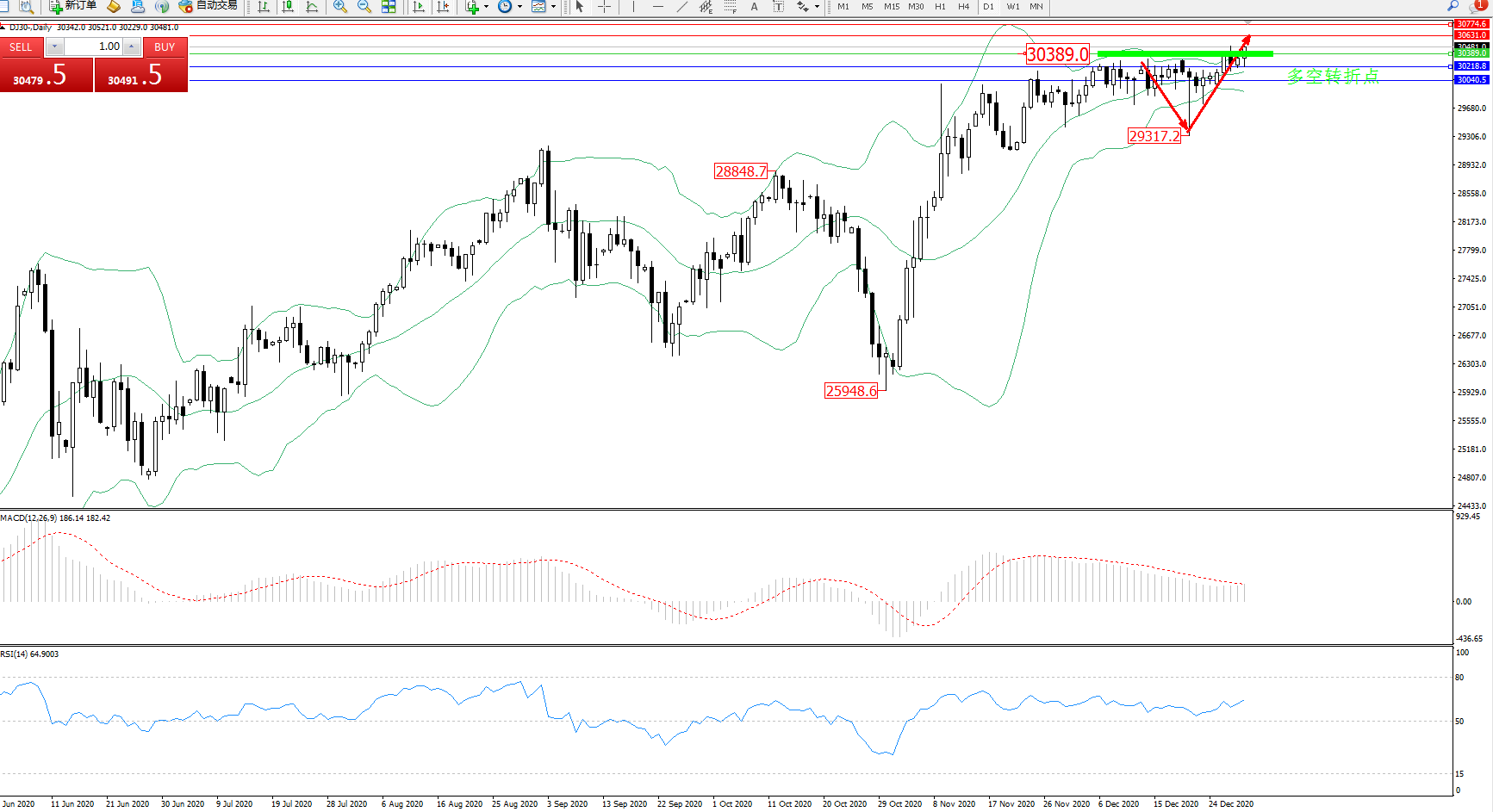 道琼斯指数DJ30—— 日K线图显示: