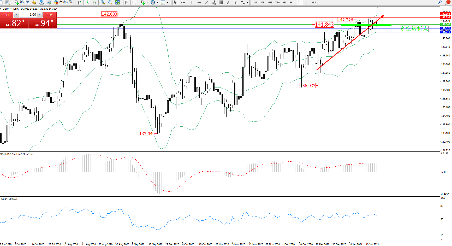 交易策略:141.843上方看涨,目标142.396、142.683