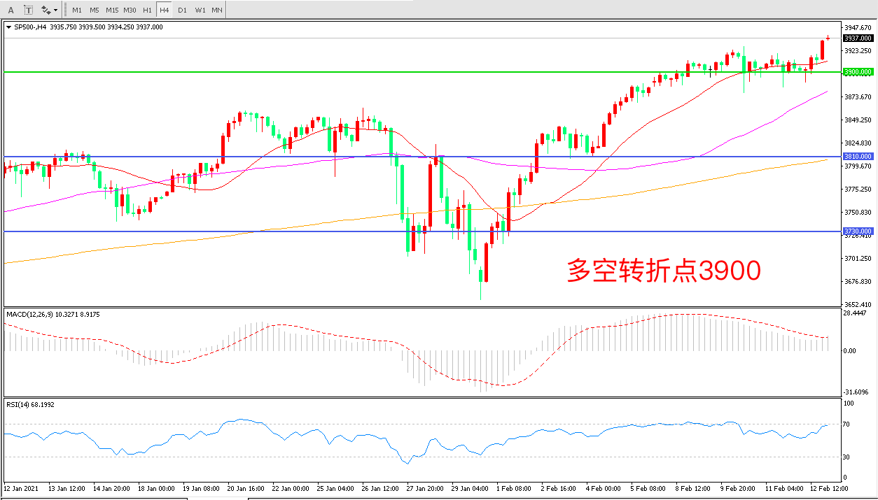 4小时图看,标普500延续高位震荡后长阳拉升,整体表现较强,3900成为下方明显支撑,均线系统呈多头排列,MACD红柱增加,RSI指标向上,日内延续上行概率较大。