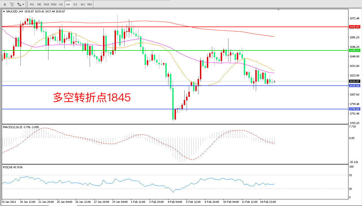 周一(2月15日),由于欧美疫情有所缓解,市场风险情绪高涨,美债收益率整体走高,增加了持有黄金的机会成本,现货黄金延续低位震荡,收报1818.74美元/盎司。目前由于乐观的经济增长预期推高了债券收益率,金价难以找到上行动能,实际收益率走高的环境增加了黄金作为一种非收益资产的机会成本。