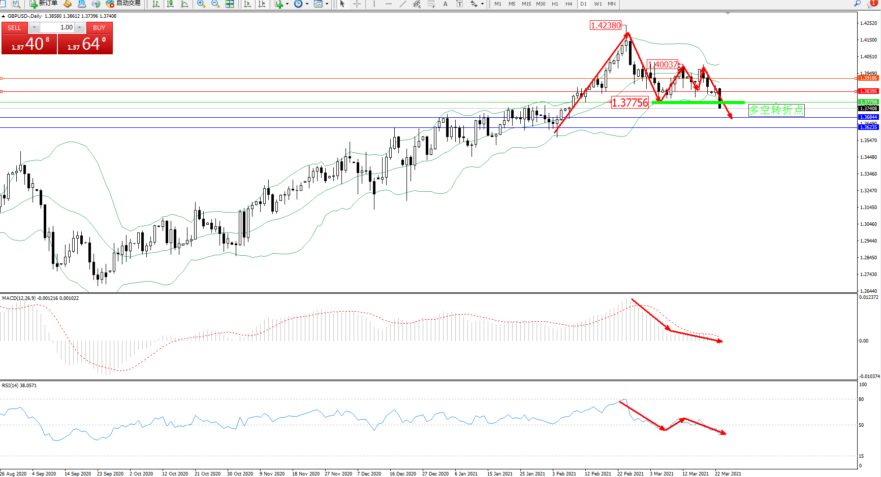 交易策略:1.37756下方看跌,目标1.36844、1.36235