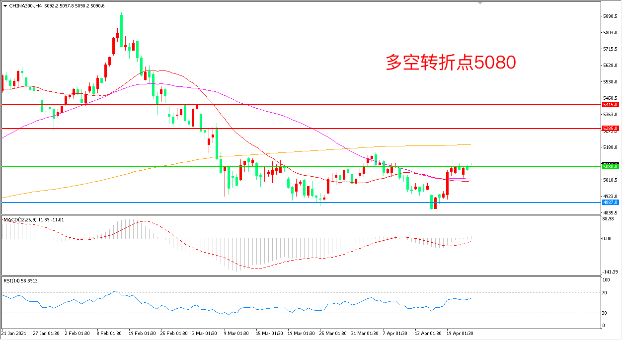 4小时图看,沪深300长阳拉升后延续高位震荡,短期表现依然较强,5080成为多空分水岭,均线系统粘合成为下方支持,MACD红柱增加,RSI指标走平,日内如能再度突破有望开启新一轮上涨行情。