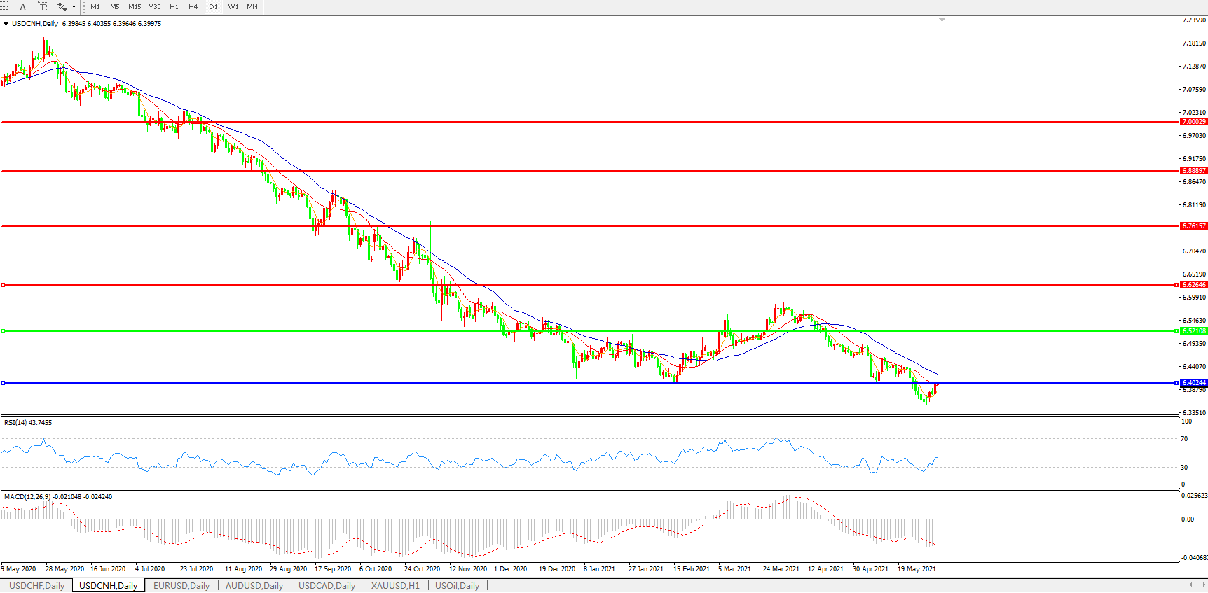 美元兑人民币USDCNH 日线图: