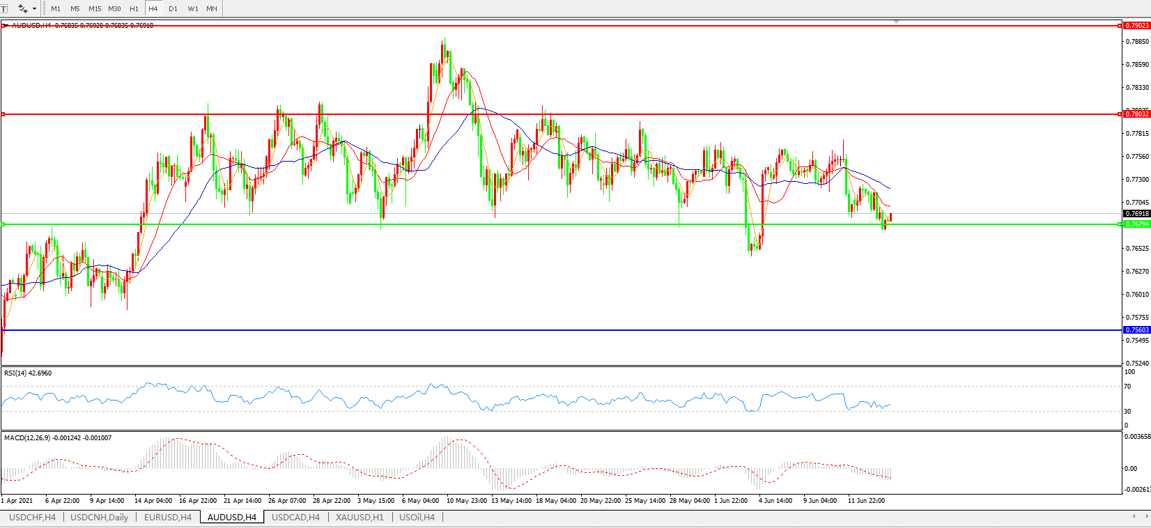 备选策略:0.7680下方看跌,目标0.7560、0.7400