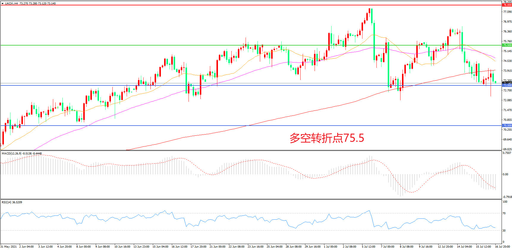 4小时图看,油价长阴下破,前期涨幅被吞噬殆尽,75.5美元成为短期多空分水岭,均线系统粘合形成上方阻力,MACD绿柱增加,RSI指标走平,日内震荡下行概率较大。
