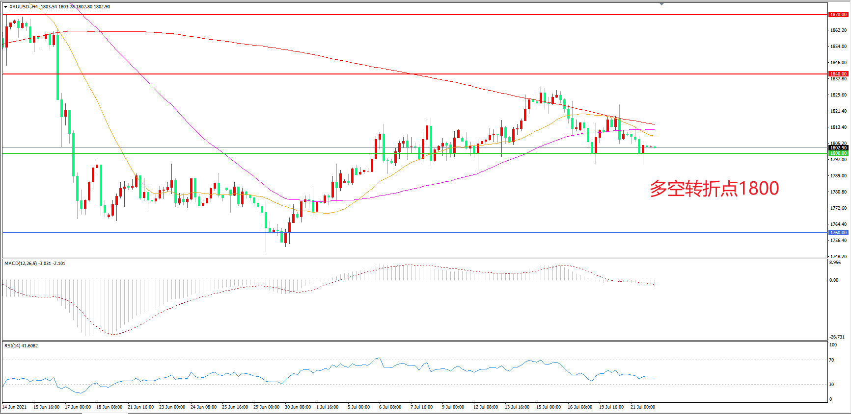 交易策略: 在1800.00之上看涨,目标1840.00 1870.00