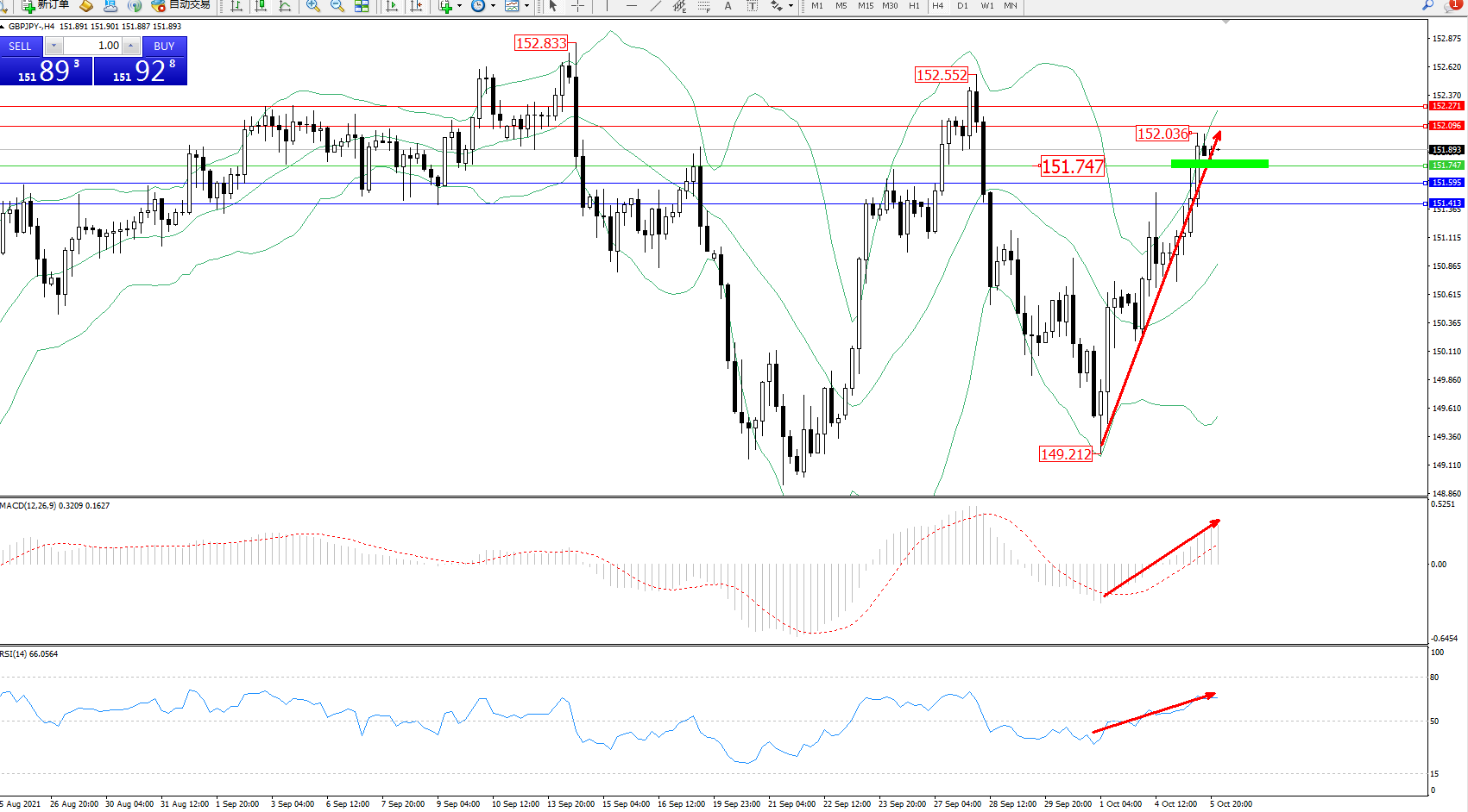技术点评:多头动力延续布林带指标上轨附近强势拉升上扬,高位抵达152.036位置持续震荡向上移动,短期未见止步迹象,前期高位152.552位置近在咫尺破位在即,布林带指标呈张口走势持续震荡,MACD指标处于多头区域持续震荡上移,RSI指标处于多头区域维持整理向上移动中;