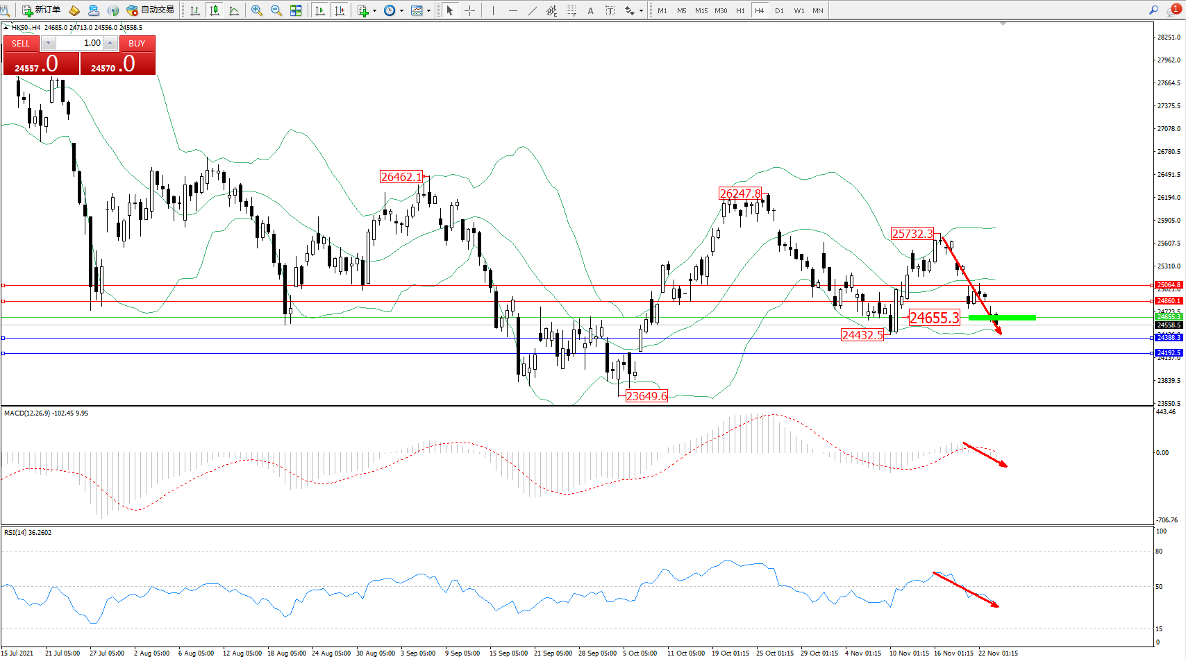 恒指HK50 ——4小时K线图显示: