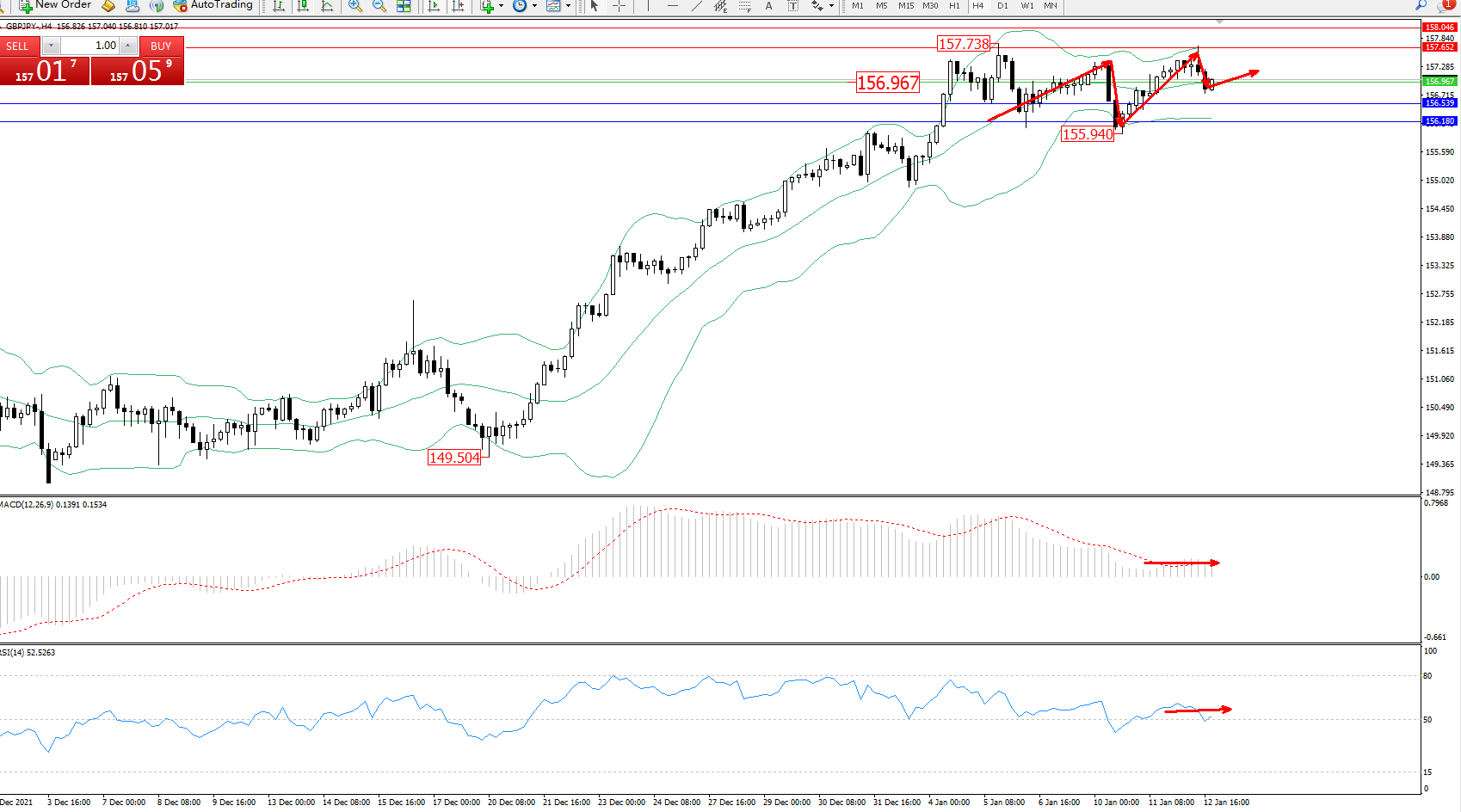 备选策略:156.967下方看跌,目标156.539、156.180