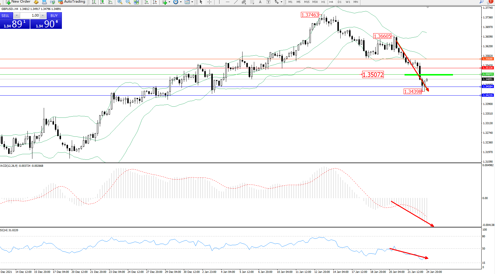 交易策略:1.35072下方看跌,目标1.34584、1.34235