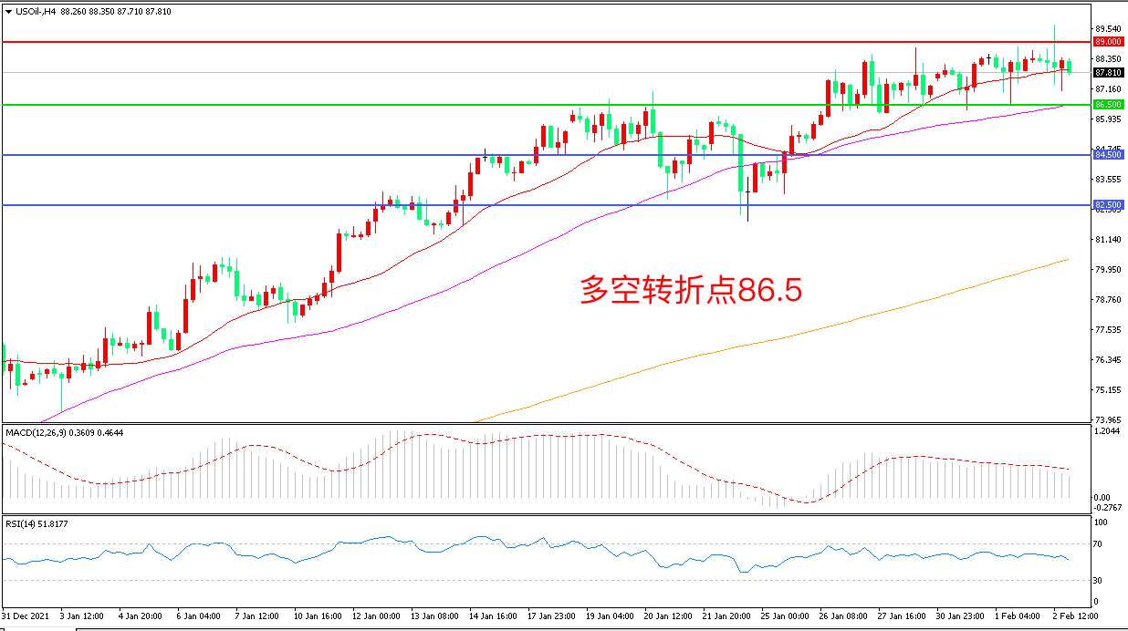 交易策略:在86.50之上看涨,目标89..00 92.00