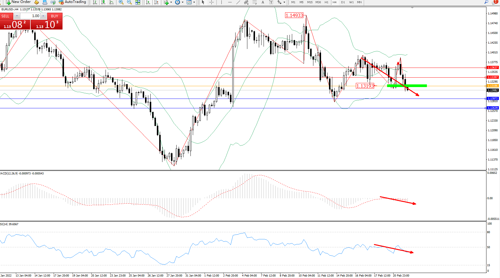 交易策略:1.13193下方看跌,目标1.12872、1.12639