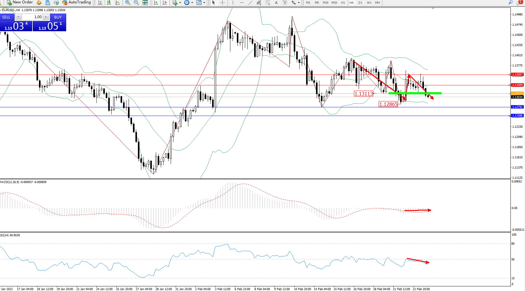 交易策略:1.13113下方看跌,目标1.12792、1.12588