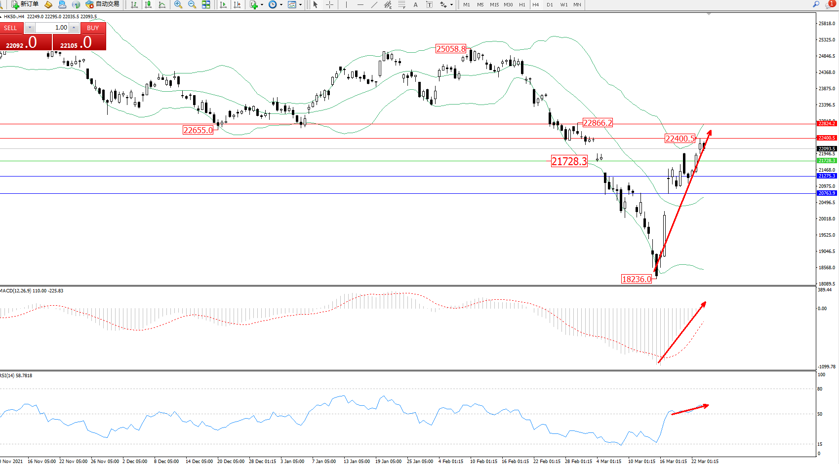 技术点评:低位多头动力强势震荡上扬,即将触及布林带指标上轨22400附近节点后整理,短期多头上扬态势良好,布林带指标呈张口走势持续中,MACD指标低位多头动力维持震荡上移至0轴线上方徘徊中,RSI指标处于50均衡线上側弱势整理后上移中;