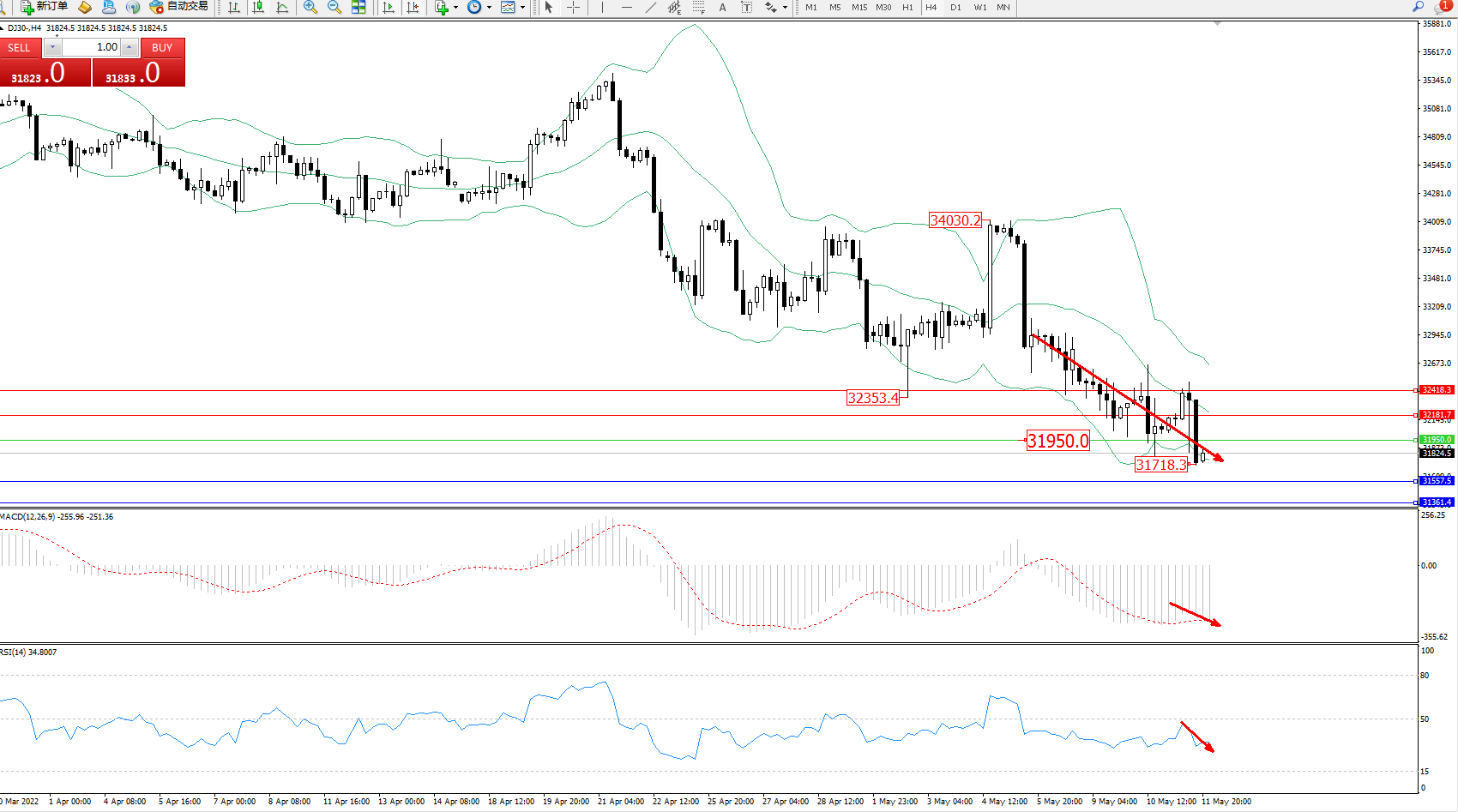 道琼斯指数DJ30——4小时K线图显示: