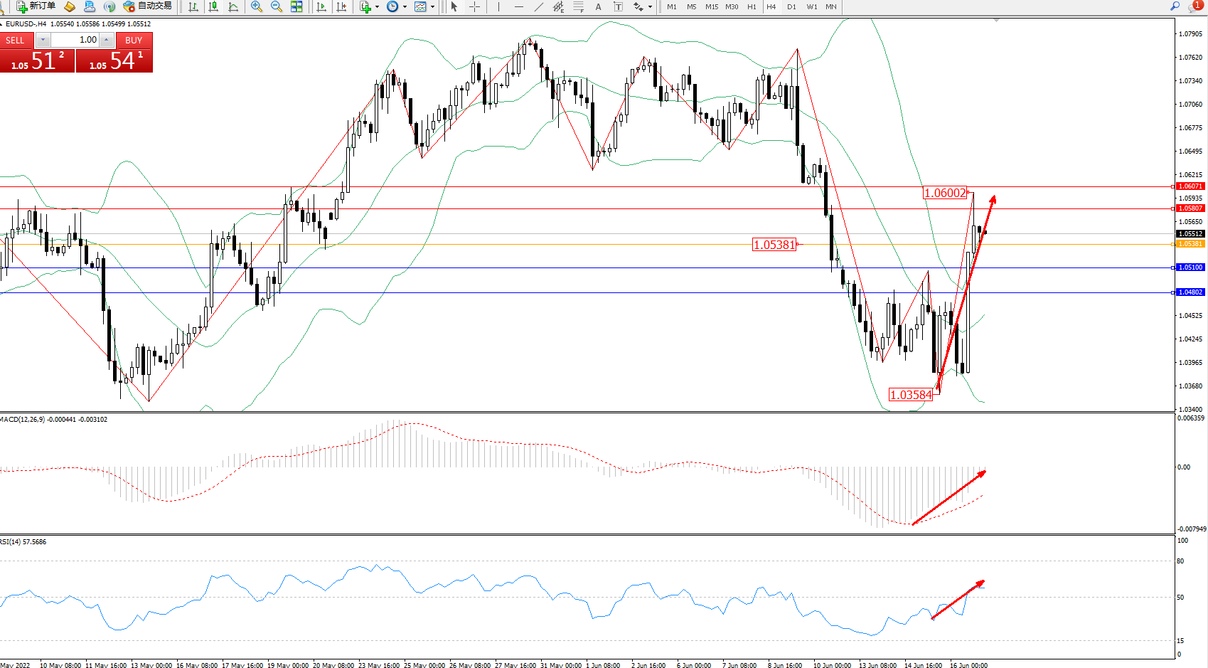 技术点评:低位多动力强势拉升上扬,突破布林带指标上轨至1.06002附近震荡,短期纠结于布林带指标上轨附近窄幅整理,多头动力有继续向上移动态势,布林带指标呈张口走势持续中,MACD指标处于空头区域维持震荡缓慢上移至0轴线附近徘徊,RSI指标处于50均衡线上側窄幅整理;