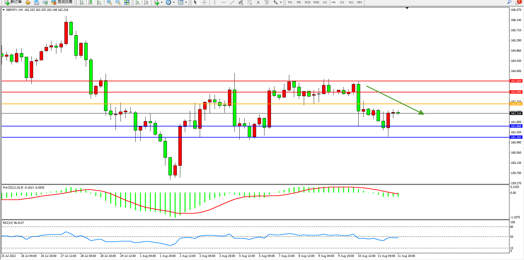 交易策略:162.606下方看跌,目标161.666、161.202