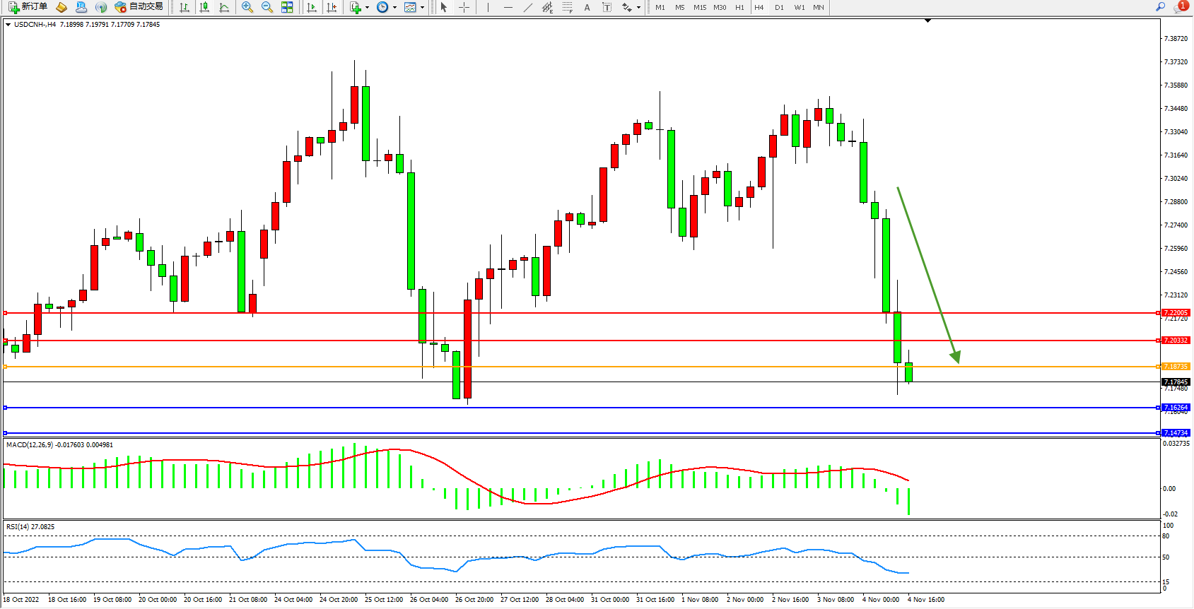 美元人民币USDCNH——4小时K线图显示: