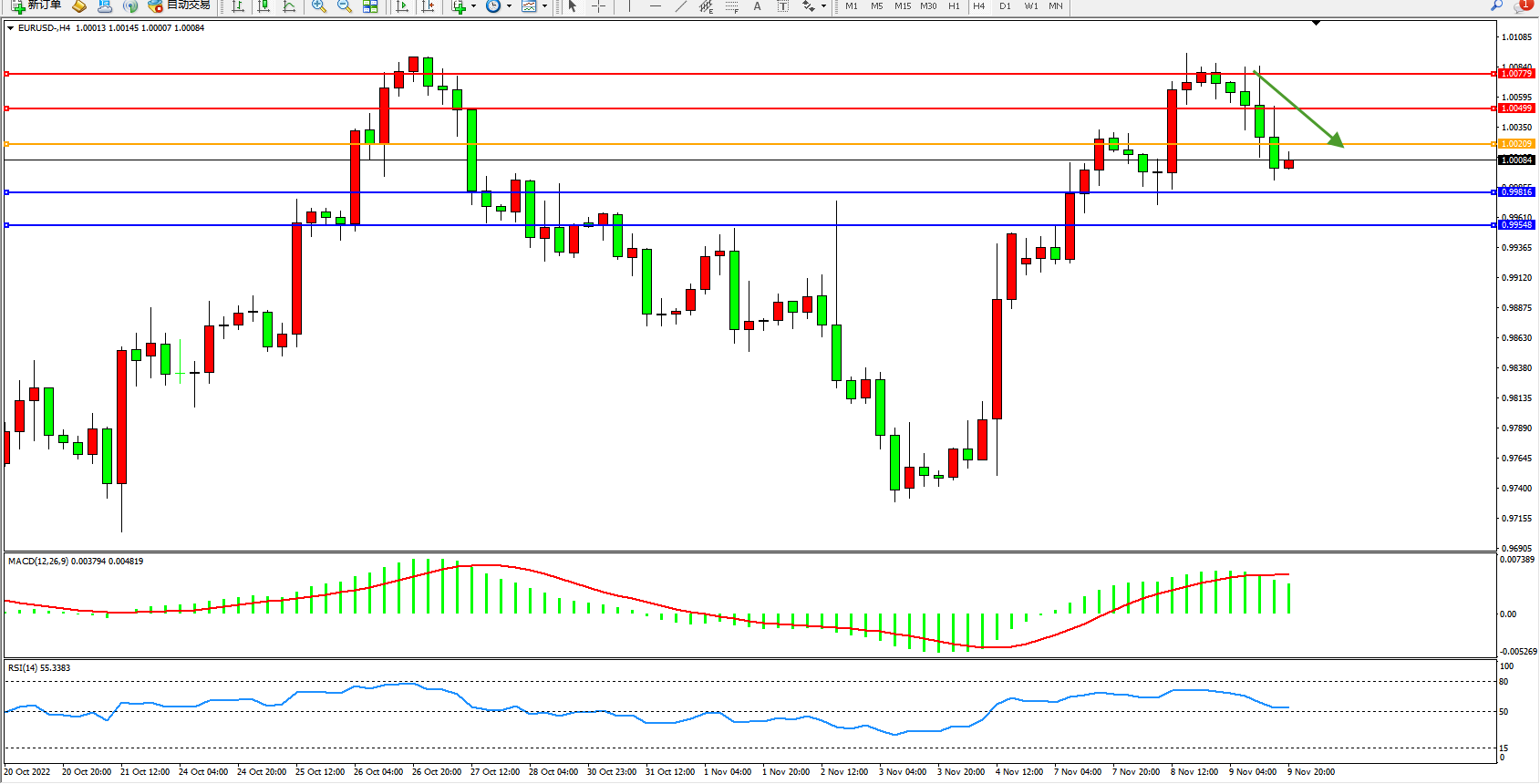 支撑:0.99816、0.99548