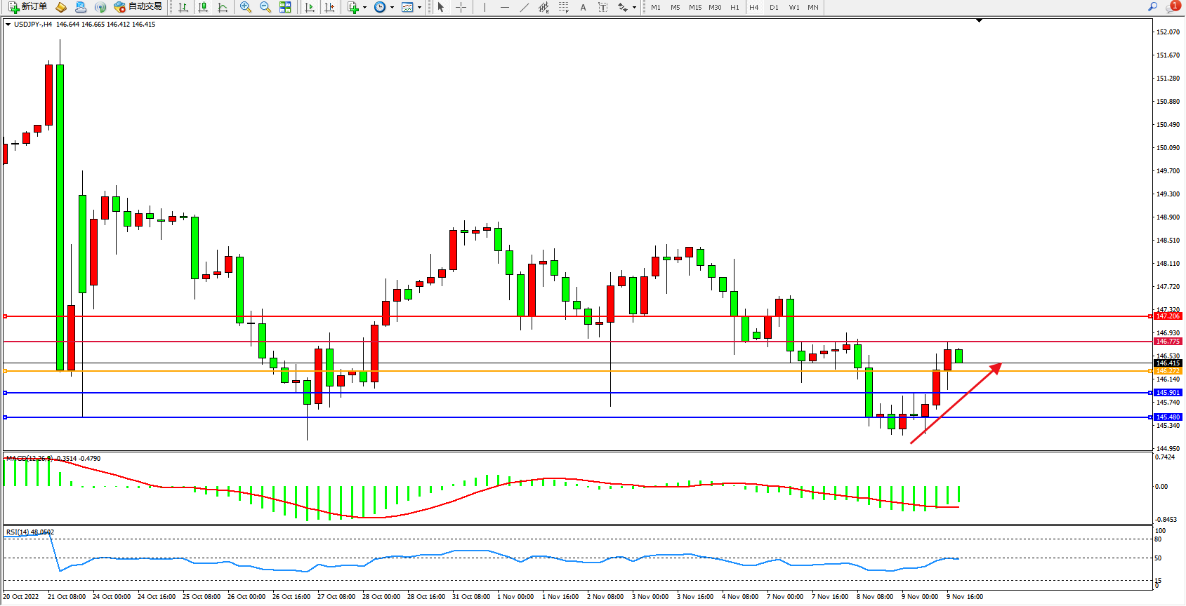 备选策略:146.272下方看跌,目标145.901、145.480