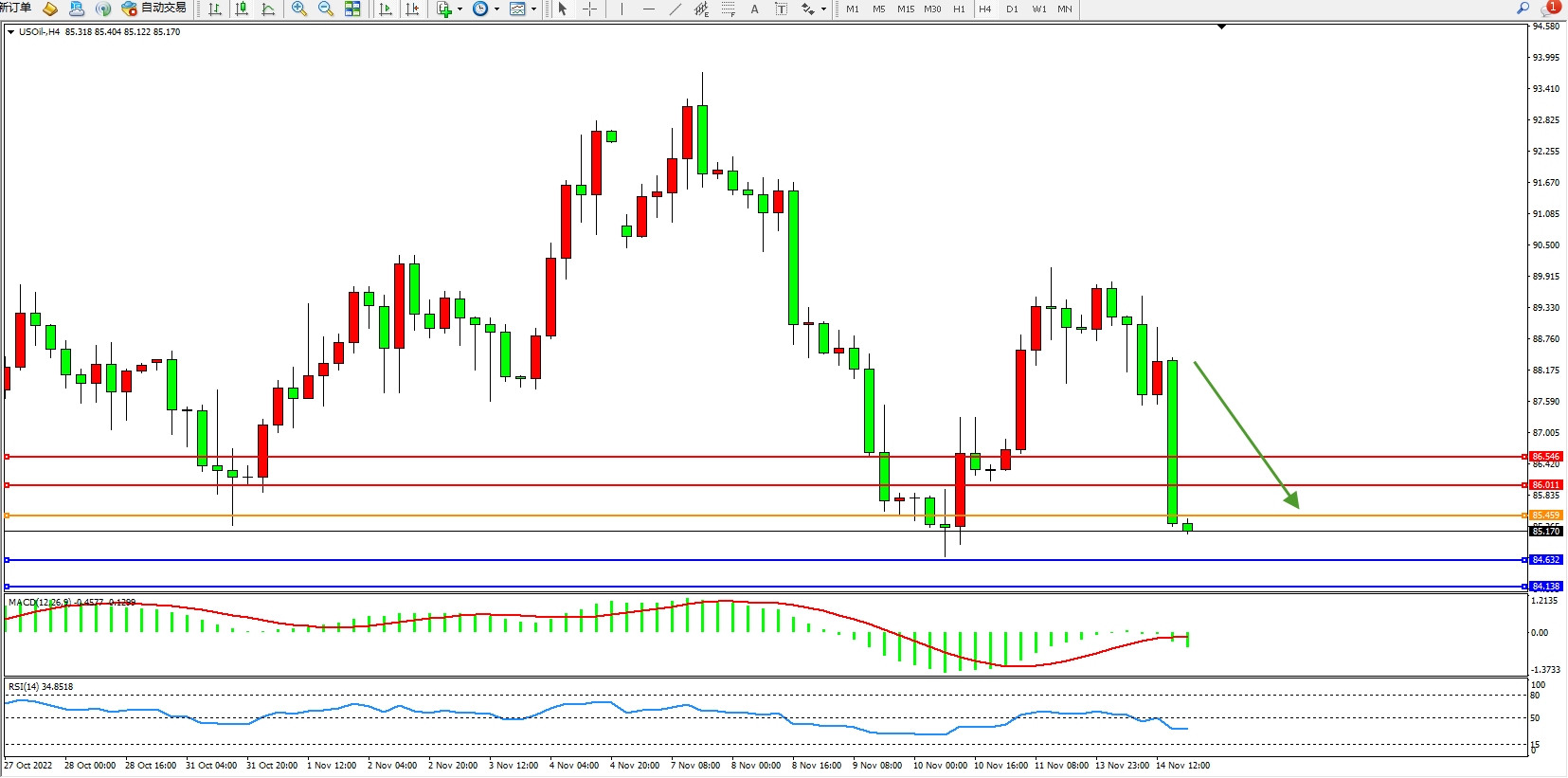 4小时图看:空头动力急速下挫,短期跌势或将延续,市场整体处于空头下行态势,MACD指标处于0轴线下侧弱势徘徊;