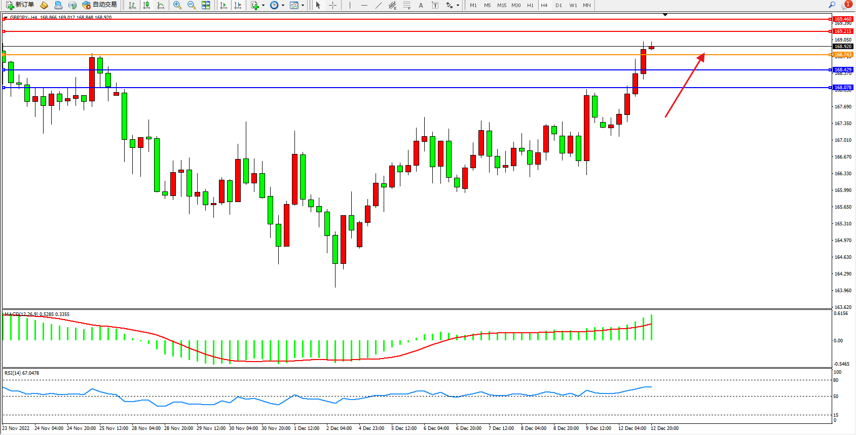 交易策略:168.743上方看涨,目标169.215、169.460