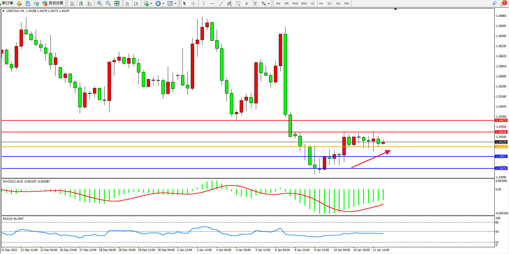 美元加元USDCAD——4小时K线图显示:
